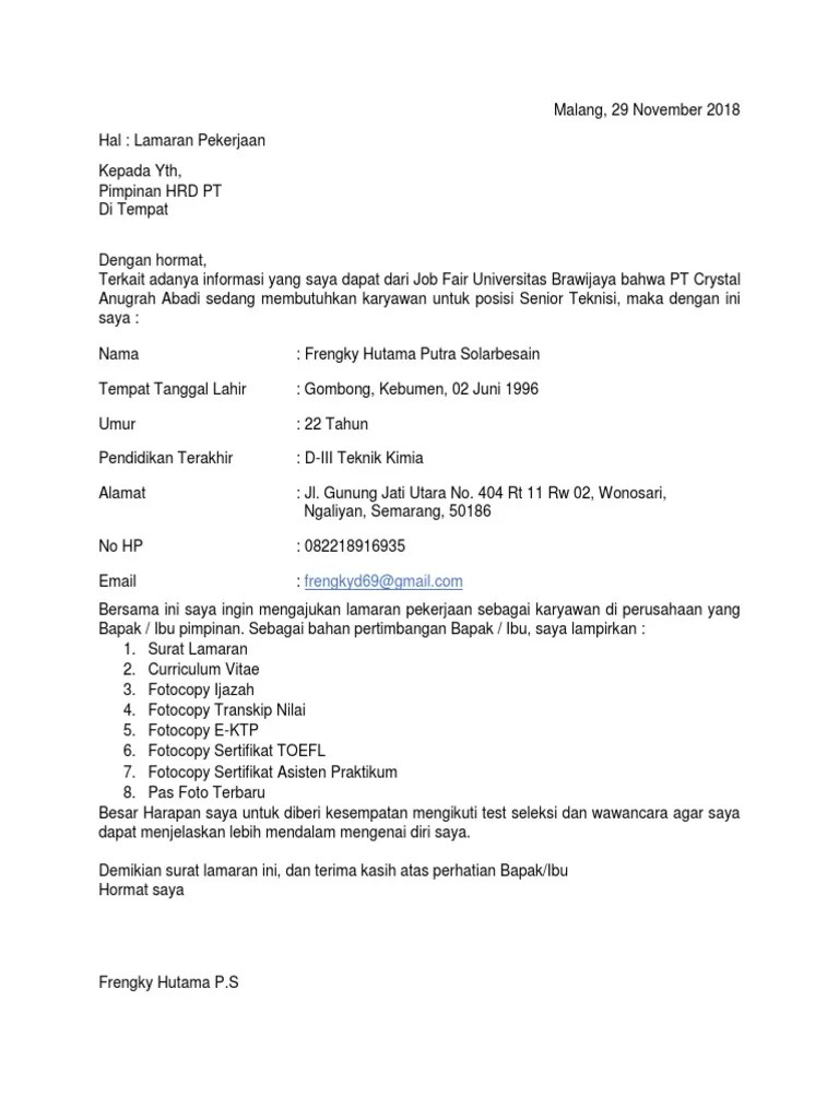Lamaran pekerjaan kepada yth, pimpinan hrd pt wilmar nabati indonesia dengan hormat, ter.
